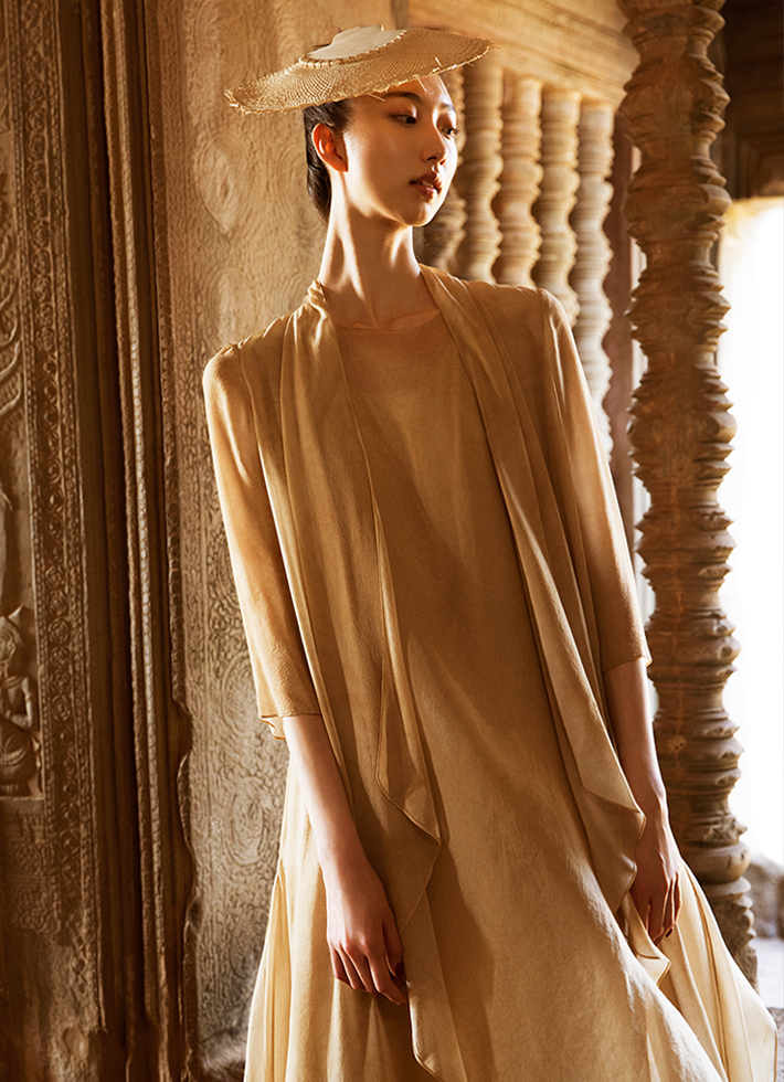 The creations are made from pure natural superior silk, rib, raw silk, linen, wool and silk wool with elegant colors and comfortable and smooth silhouettes. By adopting oriental traditional handicraft, they strive to center around people and highlight harmony to allow graceful, calm, free and romantic women to demonstrate their romantic and unrestricted free will in their tasteful life.